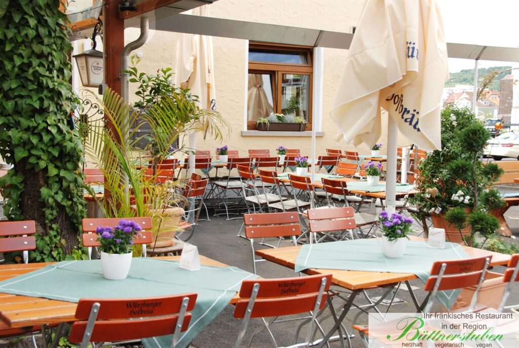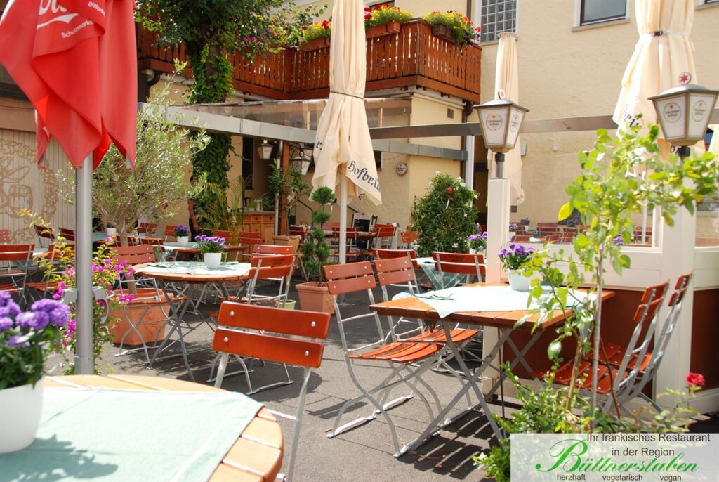 Direkt an unserem Haus entlang gelangen Sie in den idyllischen Biergarten der Büttnerstuben. Umgeben von Blumen und gemütlichen Holz Möbeln, genießen Sie hier fränkische Küche in entspannter Atmosphäre. Der Biergarten im Innenhof bietet den perfekten Ort, um den Alltag hinter sich zu lassen und bei einem Schoppen fränkischen Weins einen lauen Sommerabend zu verbringen.